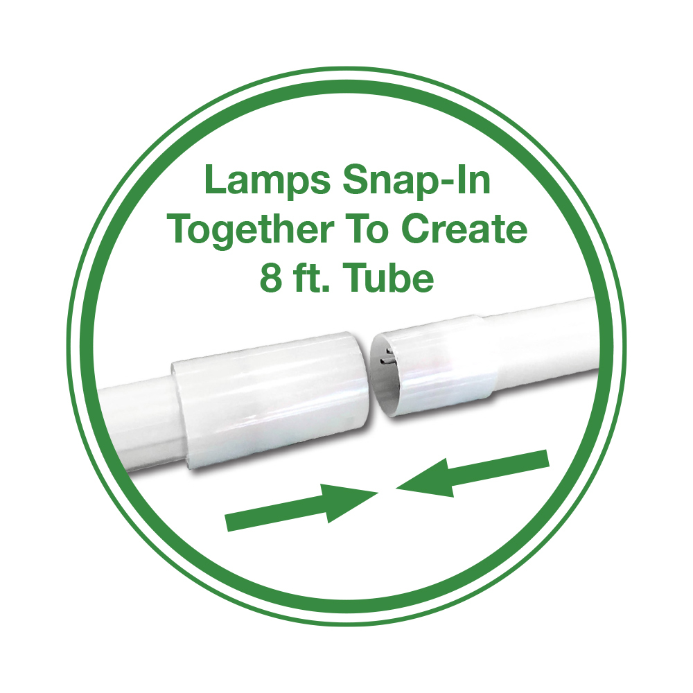 Two 4 ft. lamps snap-in together via proprietary joint to create an 8 ft. LED tube.
